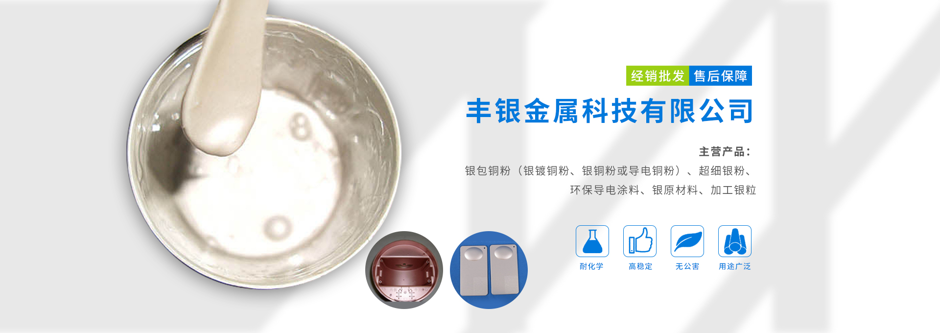 東莞市豐銀金屬科技有限公司科技力量雄厚,公司產(chǎn)品涉及了貴金屬原材料,高科技復(fù)合材料以及互聯(lián)網(wǎng)等高科技領(lǐng)域,有著多年開發(fā)經(jīng)驗。主營產(chǎn)品:銀包銅粉(銀鍍銅粉、銀銅粉或?qū)щ娿~粉)、超細(xì)銀粉、環(huán)保導(dǎo)電涂料、銀原材料、加工銀粒。公司擁有先進(jìn)的金屬粉體生產(chǎn)技術(shù)人才和設(shè)備。產(chǎn)品銷往全國各地,并出口到韓國,符合國際ROHS標(biāo)準(zhǔn)。公司本著“誠信、合作、發(fā)展”的企業(yè)宗旨。竭誠為廣大用戶和商家提供優(yōu)質(zhì)產(chǎn)品、合理價格。